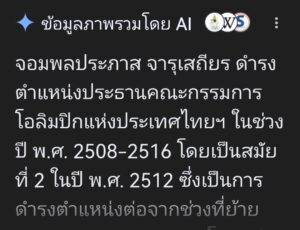 วันนี้ขอบันทึกเรื่องราวของ จอมพลประภาส จารุเสถียร ที่เข้าสู่ตำแหน่งประธานกรรมการโอลิมปิคแห่งประเทศไทยครั้งแรก ซึ่งถูกบันทึกไว้ในองค์กร หรือการค้นพบในออนไลน์ (ตามภาพ) จะระบุว่าเริ่มเข้าสู่ตำแหน่งนี้ ตั้งแต่ปี 2508 จนถึง 2516 ซึ่งผม (ผู้เขียน) พยายามค้นหาว่าจริงหรือไม่ เพราะข้อมูลต่างๆ ที่อ่านพบเรื่อยๆ นั้น ไม่ใช่ ปี พ.ศ.2508
