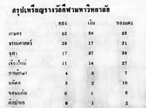 และที่ประชุมผู้แทนมหาวิทยาลัยทุกแห่ง ได้มีมติ ว่า กีฬามหาวิทยาลัยครั้งแรก จะไม่มีการมอบถ้วยรางวัลให้ผู้ชนะเลิศ หรือทีมชนะเลิศกีฬาแต่ละประเภท โดยตกลงให้ใช้ระบบสากล คือเป็นการมอบเหรียญรางวัลแทน ยกเว้นถ้วยพระราชทาน 4 ประเภทคือ ฟุตบอล แบดมินตัน กรีฑา และ ศิลปะป้องกันตัว จะให้ผู้แทนทุกสถาบันปรึกษาหารือกันว่าจะใช้วิธีการใด