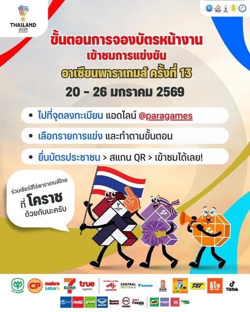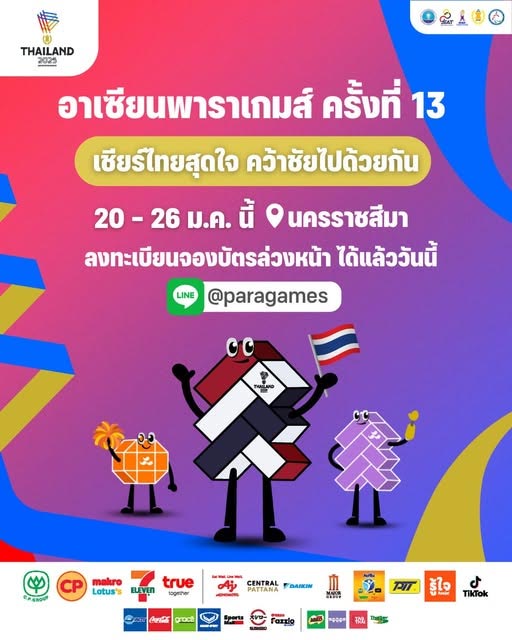 ขอเชิญชวนพี่น้องชาวไทย ร่วมเป็นส่วนหนึ่งในความภาคภูมิใจ และส่งกำลังใจให้ทัพนักกีฬาคนพิการทีมชาติไทย ในการแข่งขันกีฬาอาเซียนพาราเกมส์ ครั้งที่ 13 “เชียร์ไทยสุดใจ คว้าชัยไปด้วยกัน”